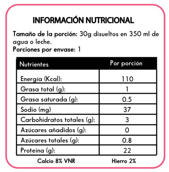 Ingredientes: Proteína aislada de suero de leche, colágeno hidrolizado bovino, café liofilizado, saborizante a vainilla, dióxido de silicio, goma guar, polidextrosa.